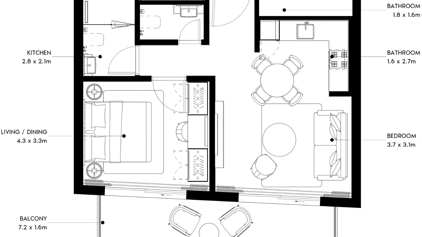 Panoramic windows span all rooms. Ceiling height reaches 3.2 meters. The kitchen includes fitted units and appliances. Wardrobes stay built into each bedroom. Bathrooms arrive fully equipped. Finishes look clean and simple.