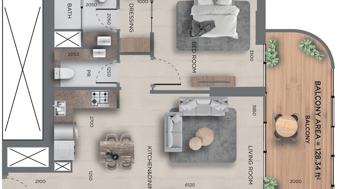You get a bright living area and a quiet bedroom. The kitchen comes ready with appliances. Wardrobes stay built in. Bathrooms include full fittings. A smart home system controls lighting and temperature. Finishes look clean and modern.