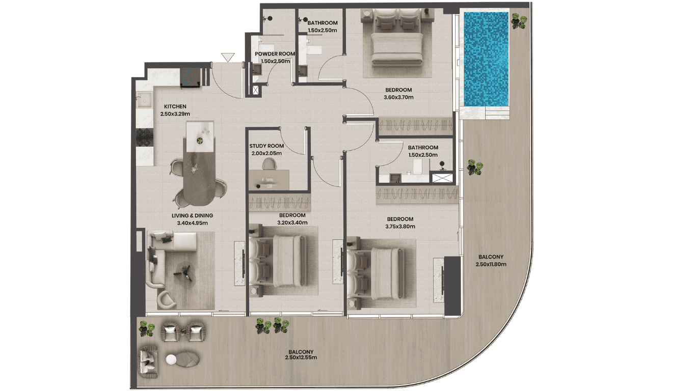 This home sits inside a 20-storey tower with glass frontage. The structure uses strong monolithic build. Ceiling height reaches 3.2 meters. Large windows bring in clear daylight. The layout offers three bedrooms with smooth flow. Some units include maid room and private pool. The kitchen features fitted cabinets and built-in appliances. Bathrooms arrive fully equipped. Built-in wardrobes support daily storage. A smart home system controls light and temperature.