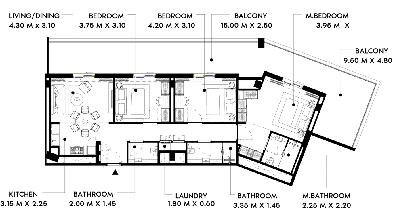 The structure follows a solid and modern design. Walls use smooth plaster finishes. Every space feels open and easy to use. The apartment fits family living and long stays.