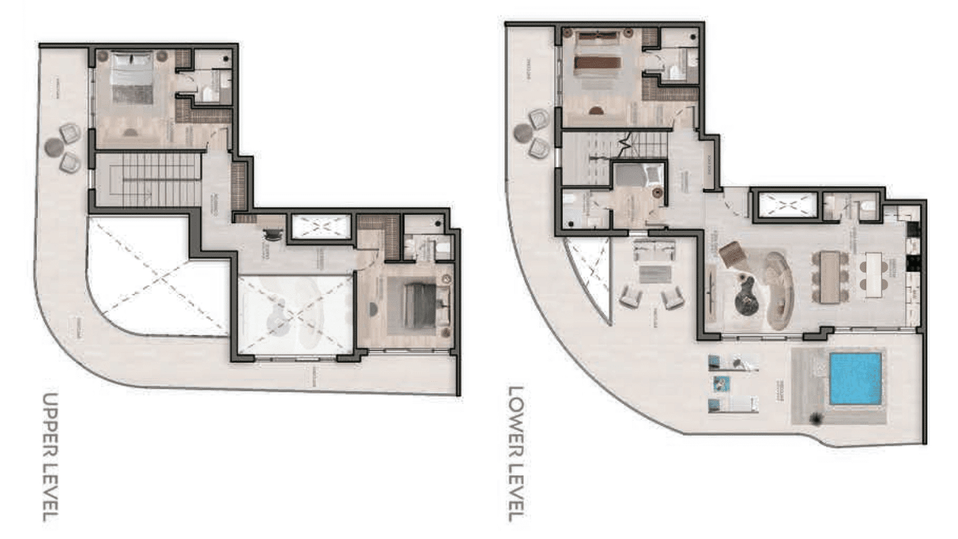 The tower shows a modern design with glass facades. Ceiling height reaches 3.2 meters. Large windows bring in natural light. Each room feels open and bright. The layout offers a master bedroom and dressing room. A maid’s room and study add extra space. Some units include a private pool. The finish stays clean and simple. The kitchen comes fully fitted with appliances.