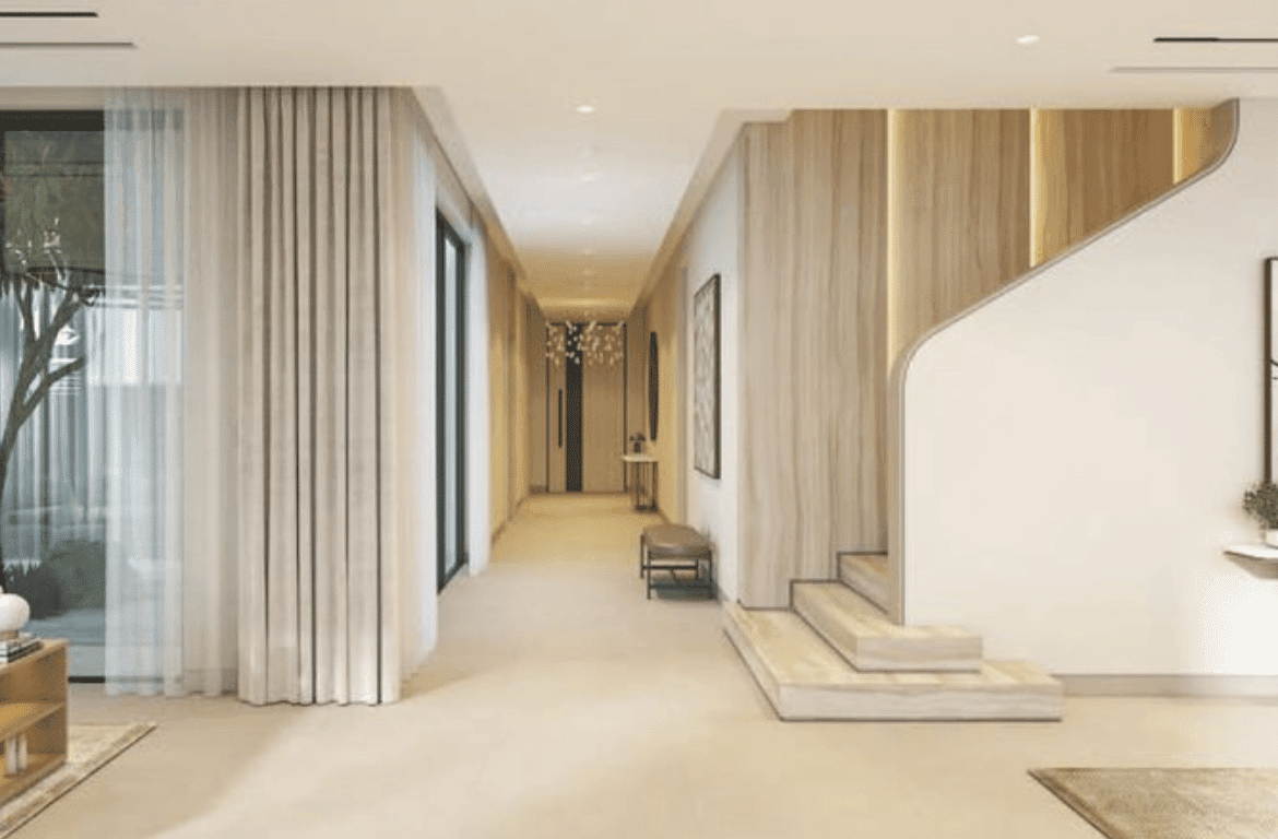 The design uses soft colours and clean finishes. Oak veneer, porcelain tiles and brushed metal details give the home a modern look, as shown in the brochure. The layout links indoor and outdoor areas with private gardens and open spaces.